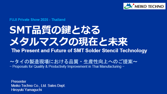 実は先日、2025年12月3日~4日にタイで開催されたマウンターメーカーFUJI様主催の「JISSO Seminar 2025 in ASEAN」に登壇してきました。 テーマは「メタルマスクの現在と未来」、現地の製造現場の方々に向け、品質・生産性向上のご提案をさせていただきました。